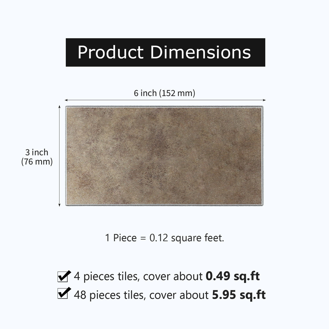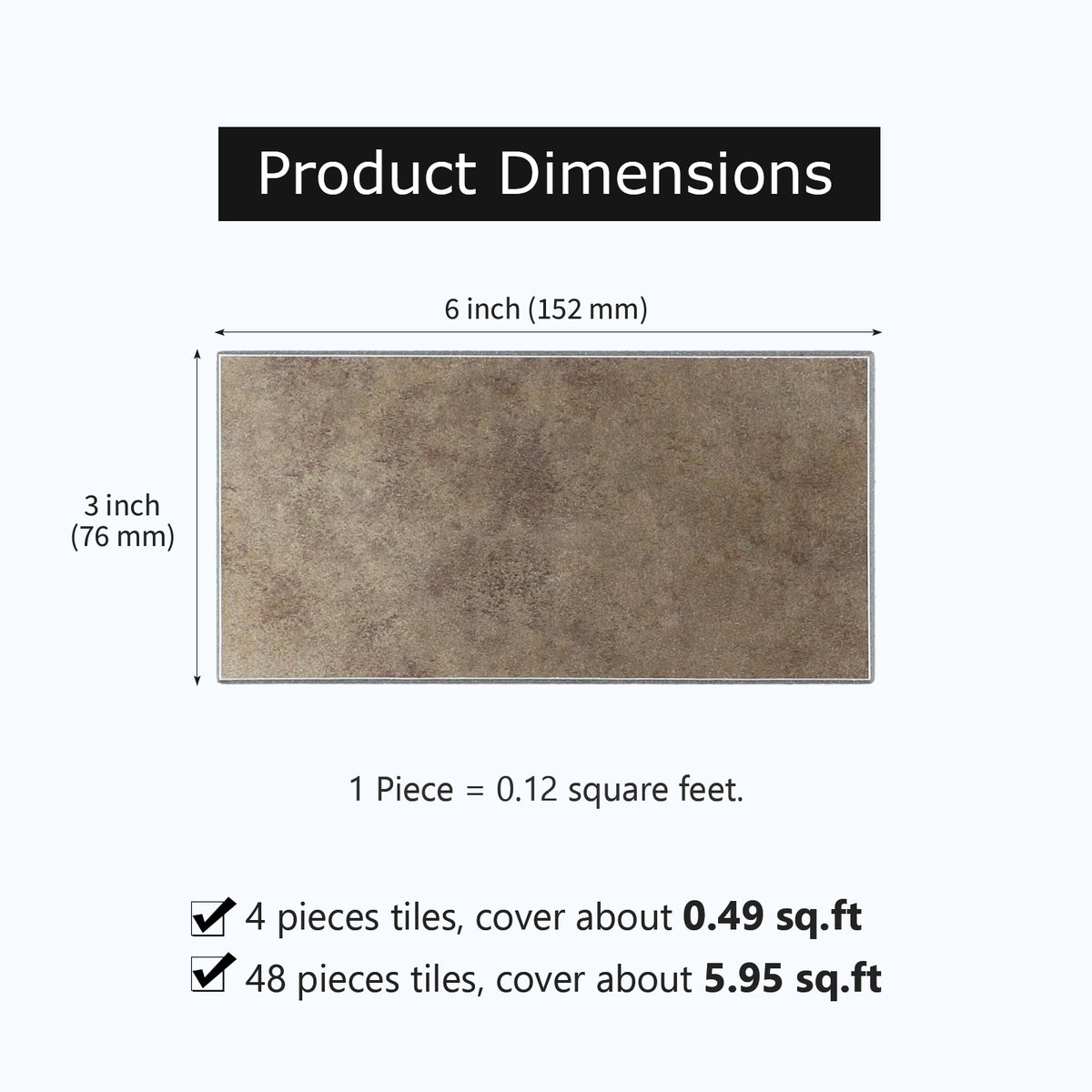 Stick on Backsplash Tiles: Come in a box of 48 pieces, each size 3" x 6" , covers about 6 sq.ft per box. Provide a metallic look. Durable kitchen backsplash tile that can create a stylish home decor by various tile layouts (such as brick, stacked, herringbone, etc).